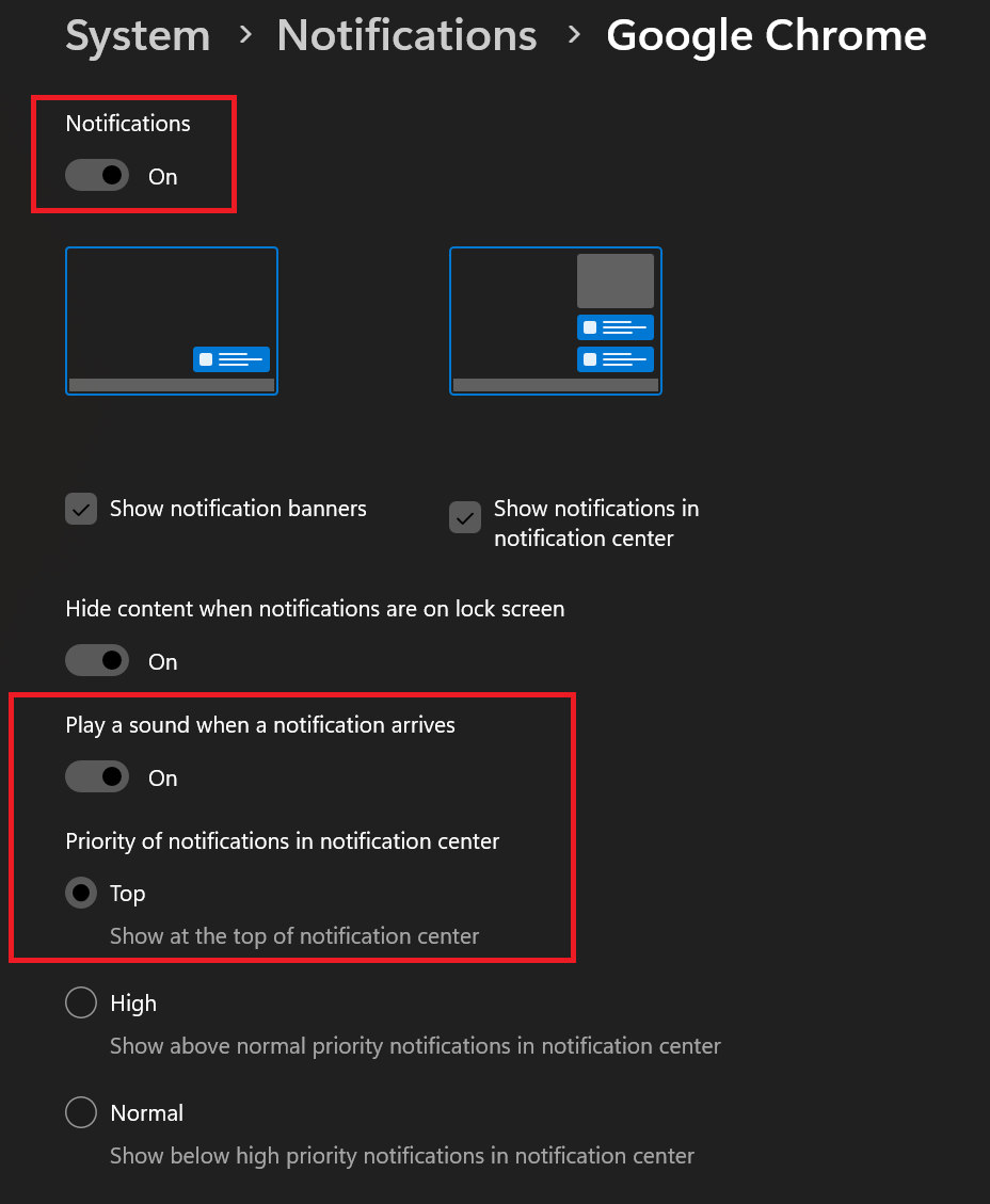 Afterwards, scroll down this page to find your web browser and click it to open advanced settings. Make sure "Notifications" and "Play a sound when a notification arrives" are "On" as well as setting the priority of notifications to Top.
